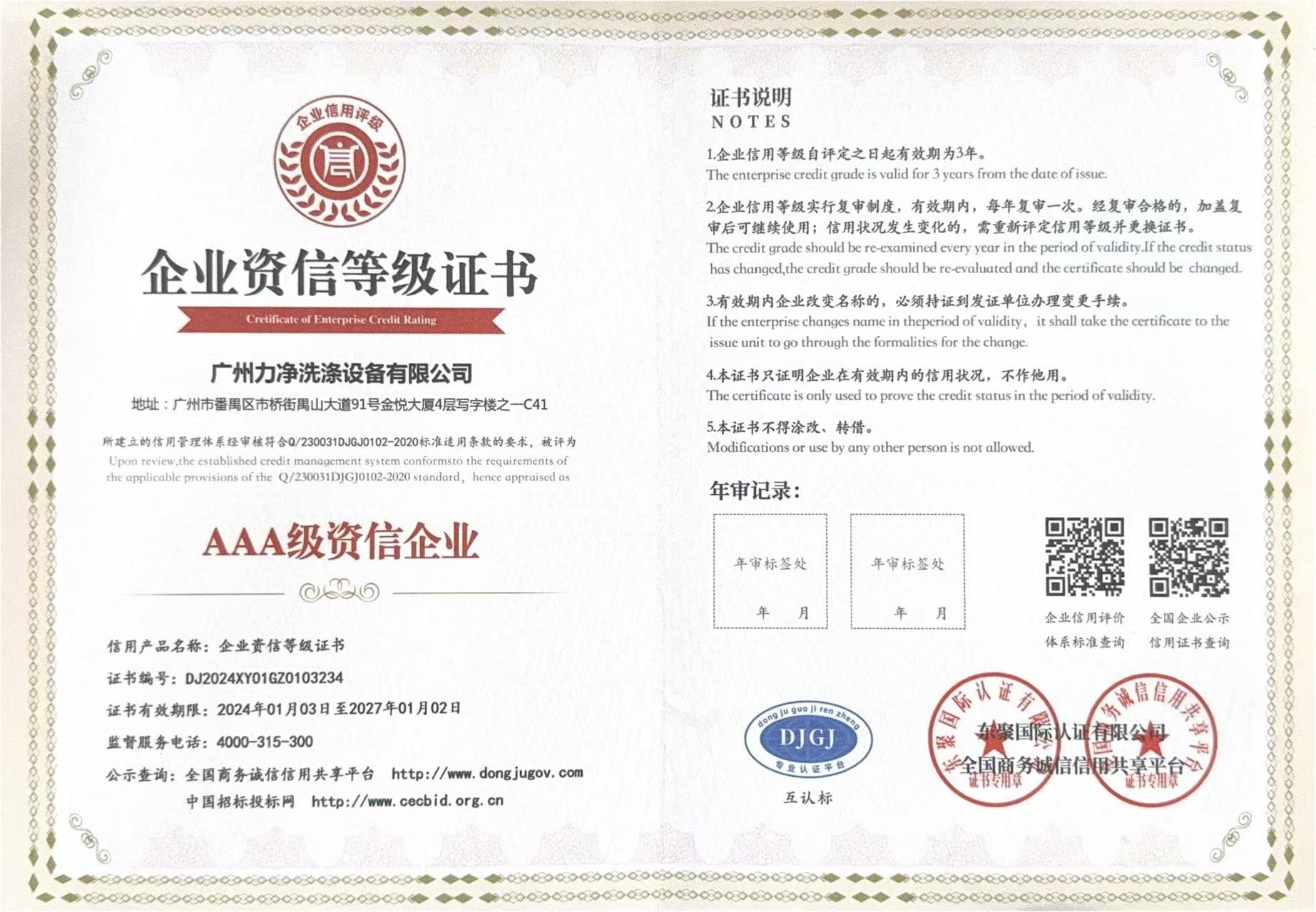 • AAA企業信用等級證書